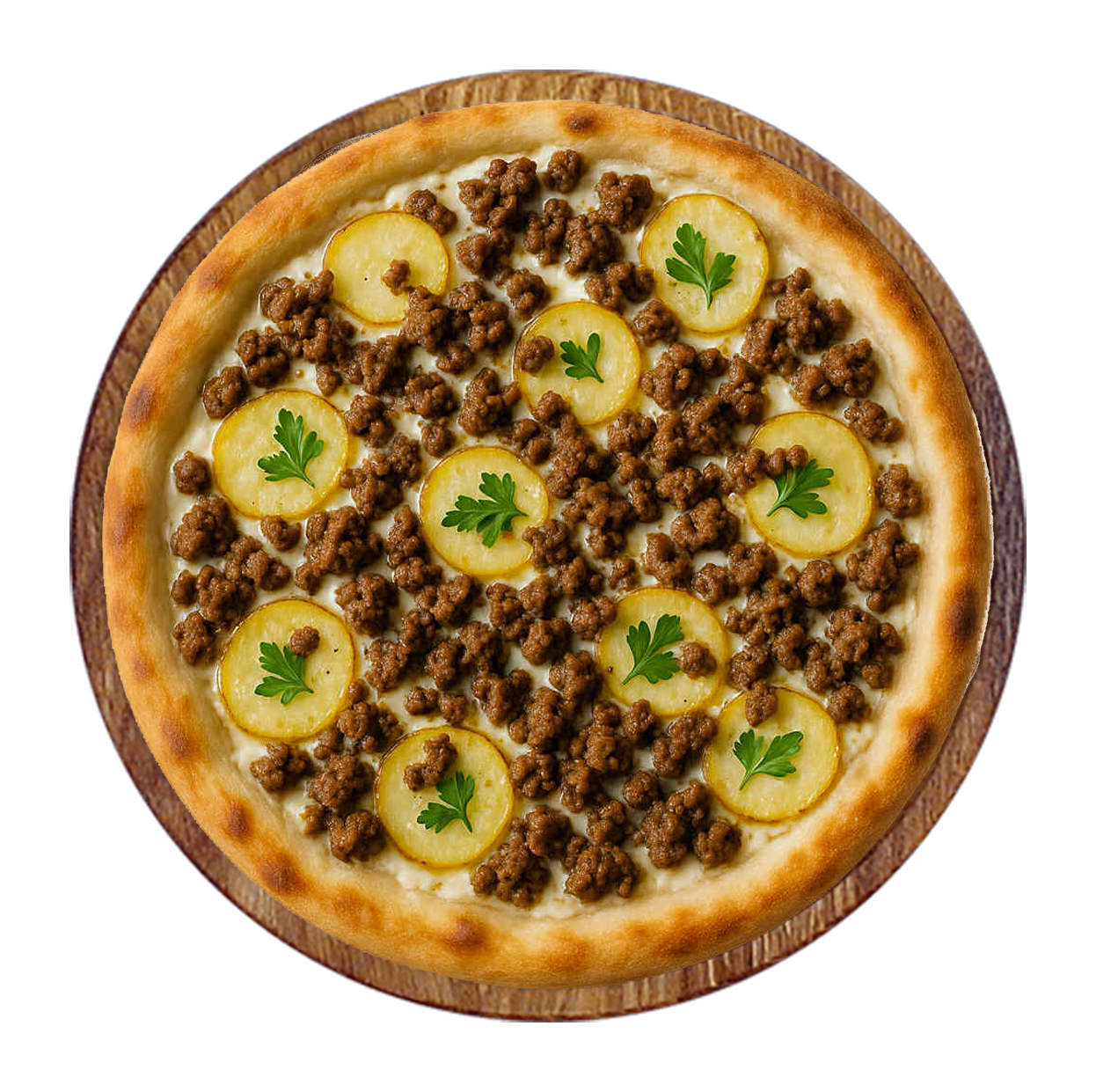 Crème fraîche, fromage, viande hachée, chorizo, poulet, oignons.