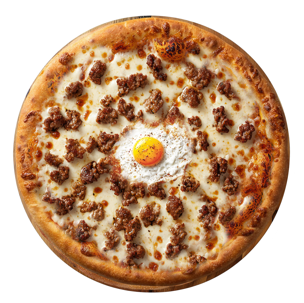Crème fraîche, fromage, viande de kebab, oignons, poivrons, olives, oeuf.