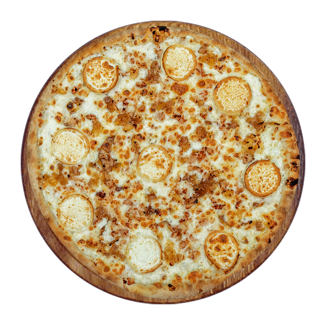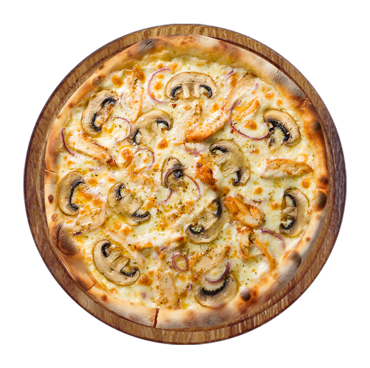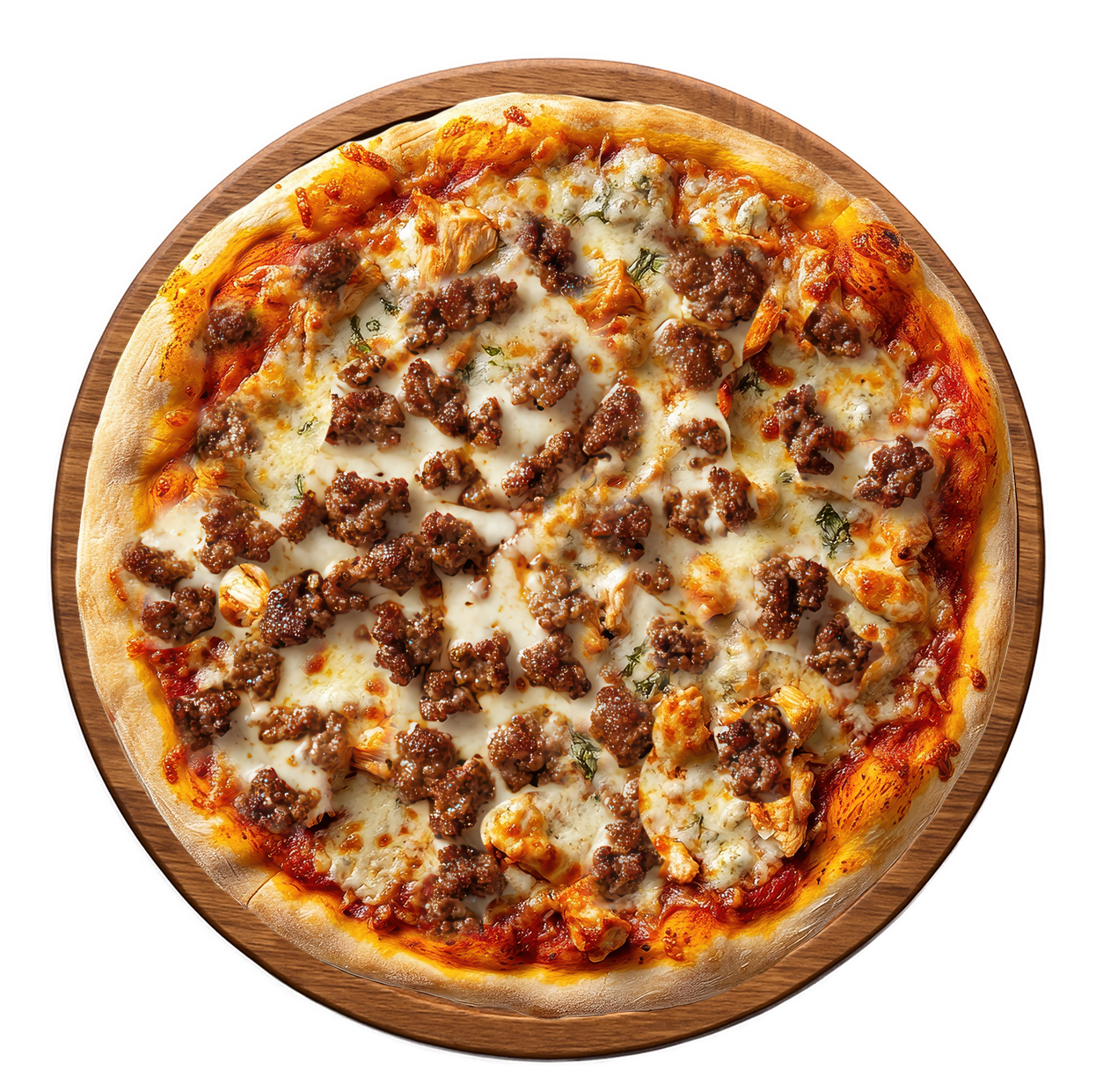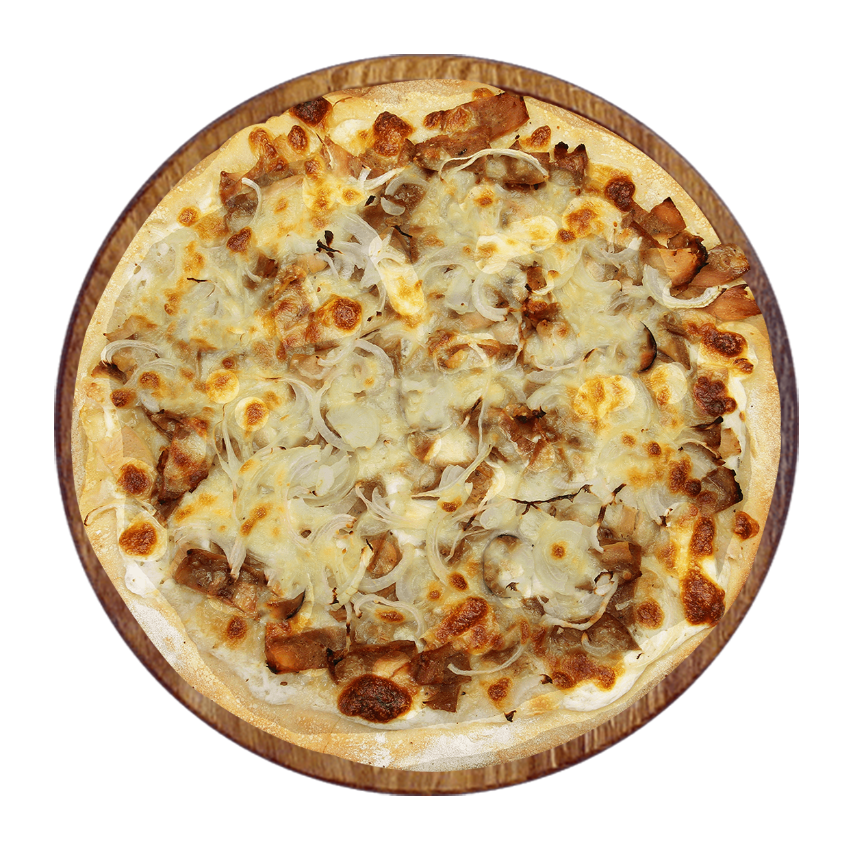 Crème fraîche, fromage, viande hachée, chorizo, poulet, oignons.